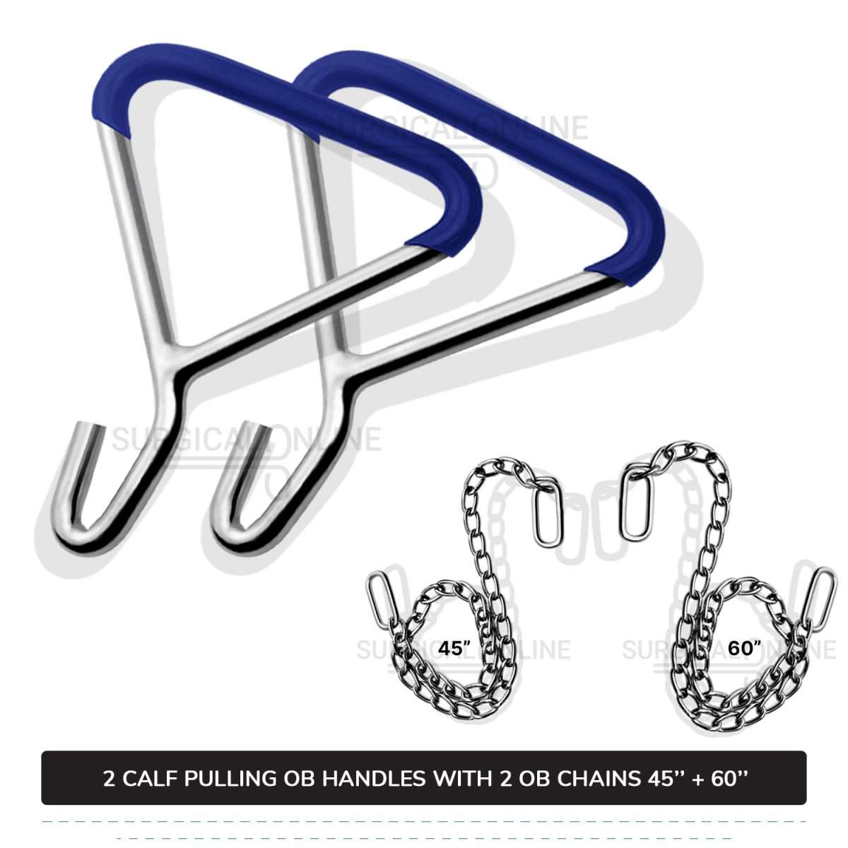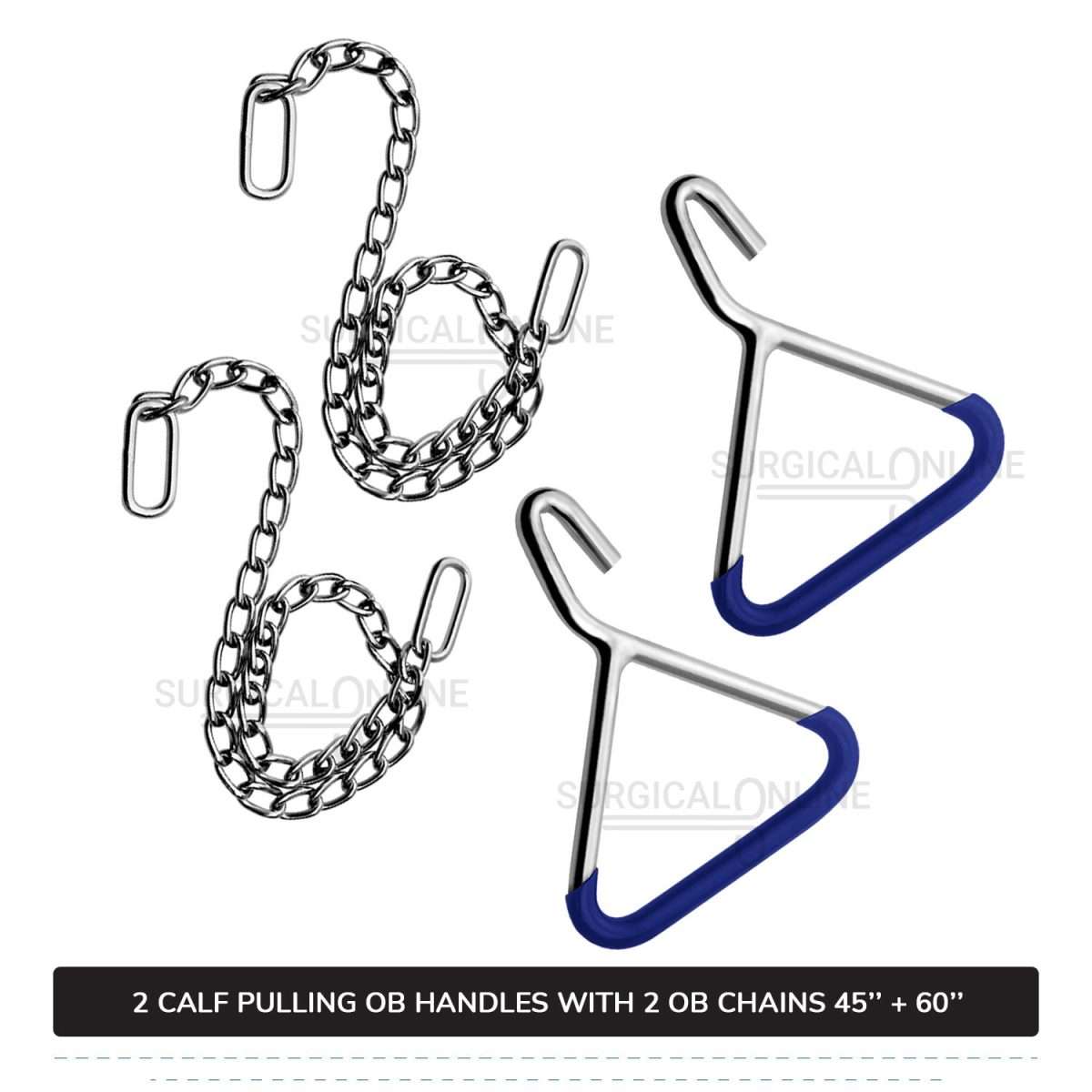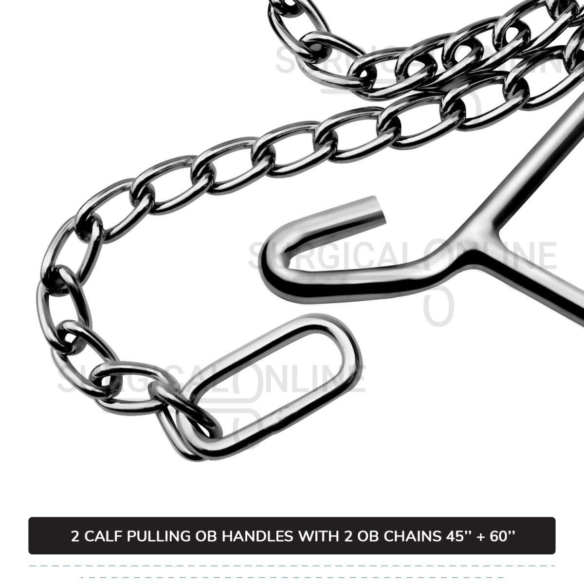 In veterinary obstetrics, practitioners use 2-OB (Obstetrical) chains 45" & 60" and handles from a Cattle Birth Delivery Set to assist with the delivery of a calf.