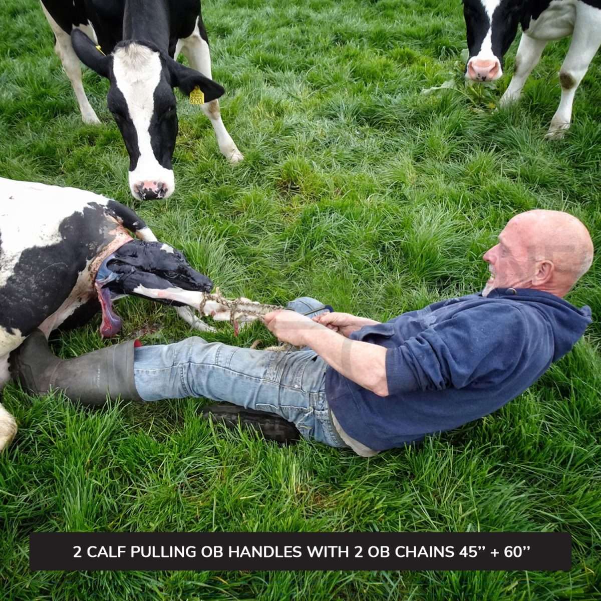 In veterinary obstetrics, practitioners commonly use 2-OB (obstetrical) chains 45" & 60" and handles to assist with the delivery of a calf during difficult or prolonged calving situations, facilitating a safer and easier delivery for the mother (cow). These tools assist in difficult deliveries, provide traction for maneuvering, facilitate controlled pulling, correct Malpositions, reduce the risk of injury, provide directional control, aid in cases of prolonged labor, and involve veterinary intervention.