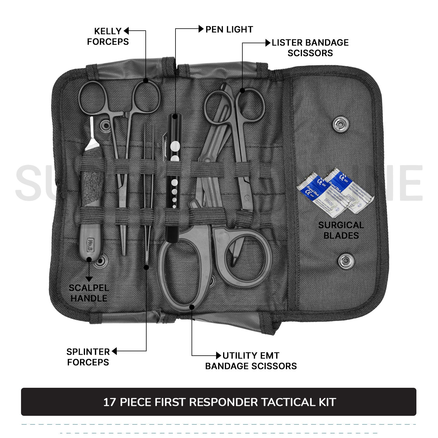 The 17 Piece First Responder Tactical Kit is an essential collection of tools designed for emergency medical professionals to handle emergencies effectively. This comprehensive kit contains a variety of instruments tailored for quick and efficient first aid response. It includes a Kelly forcep for gripping, a splinter forcep for precision removal, a scalpel handle for delicate cutting tasks, and both Lister bandage scissors and EMT utility bandage scissors for cutting through various materials. The kit also features a pen light for examining patients in low-light conditions and 11 surgical blades for various cutting needs.